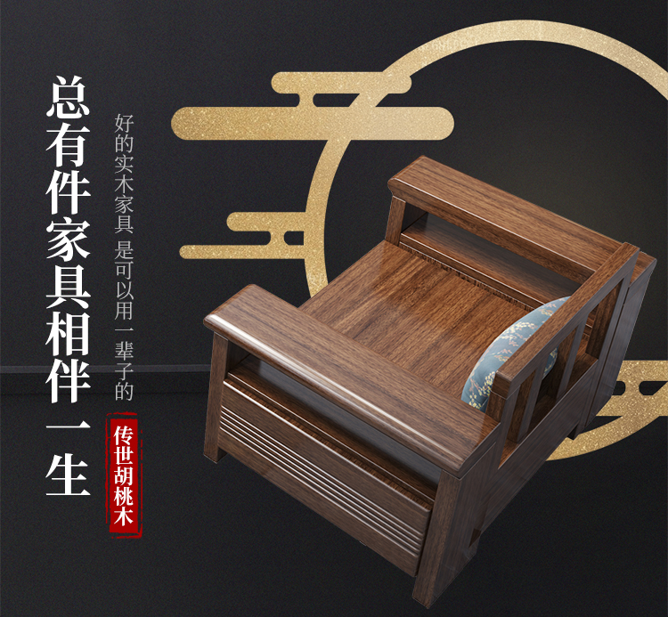 梵愛ソファ胡桃の木の実木ソファ、現代中国式のリビングルームの実木の布芸セットソファ、冬と夏の両方のストレージ版の4つのビット+足+双手すりのシングルビット