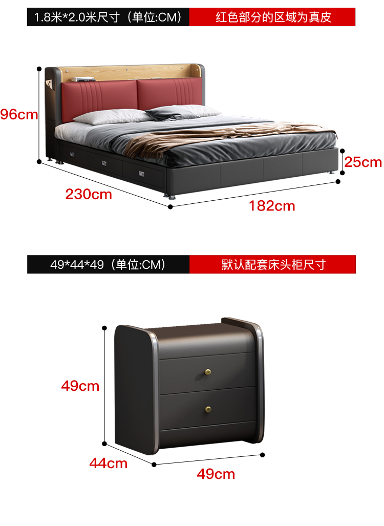 | 商品名称 | 梵愛真皮ベッド現代简約主寝台ダブルベッド1.8 m 1.5 mの小型高部屋型ロッカールーム北欧軽奢ベッドアップグレード版+三抽+気圧-ベッド+枕元棚*2 1800*2000 |